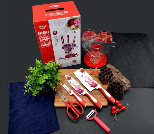 概述:品 名: 6件套不粘烤花套刀 型 号:KN-00174CK 规 格:7寸切片刀,7寸日厨刀,4寸水果 刀刃材质:X30Cr13 刀柄材质:双色
