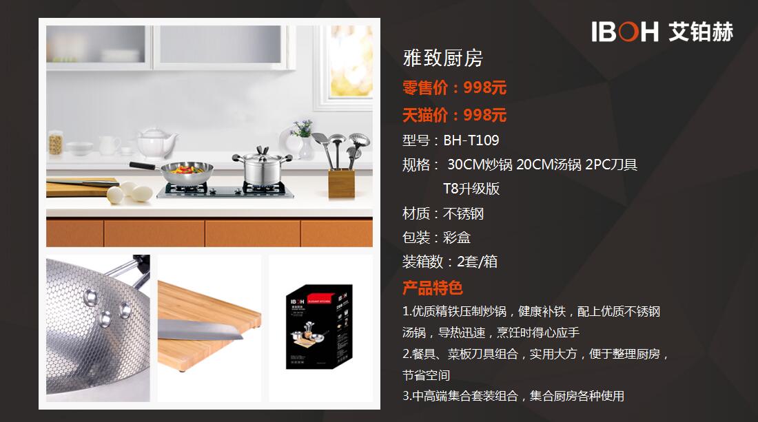 概述:型号:BH-T109 规格: 30CM炒锅 20CM汤锅 2PC刀具 T8升级版 材质:不锈钢 包装:彩盒 装箱数:2套/箱