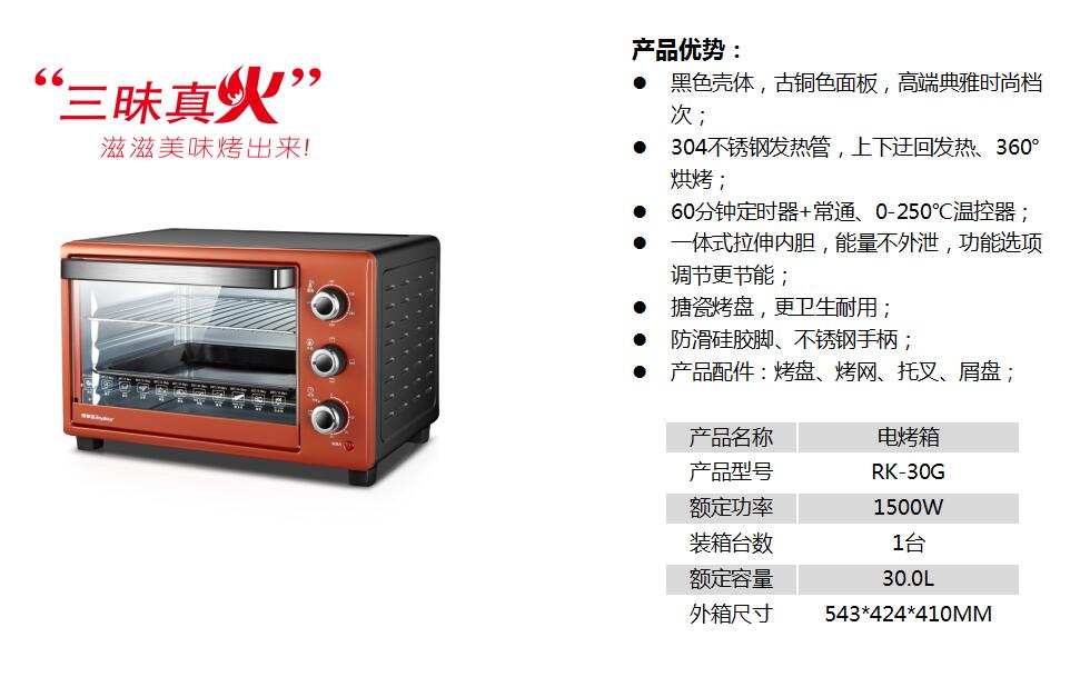 概述:黑色壳体,古铜色面板,高端典雅时尚档次; 304不锈钢发热管,上下迂回发热、360°烘烤; 60分钟定时器+常通、0-250℃温控器; 一体式拉伸内胆,能量不外泄,功能选项调节更节能; 搪瓷烤盘,更卫生耐用; 防滑硅胶脚、不锈钢手柄; 产品配件:烤盘、烤网、托叉、屑盘;