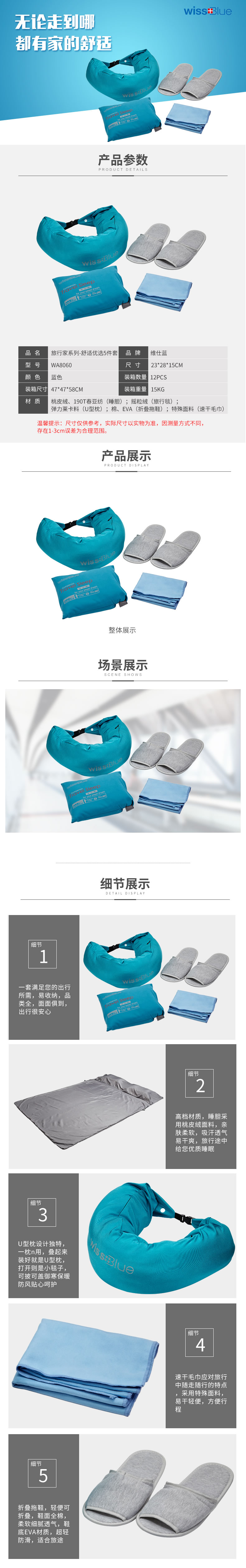 尺寸:220*150CM(睡胆)、150*120CM(旅行毯)、17*74CM(U型枕)、100*30CM(速干毛巾)、均码(拖鞋)
