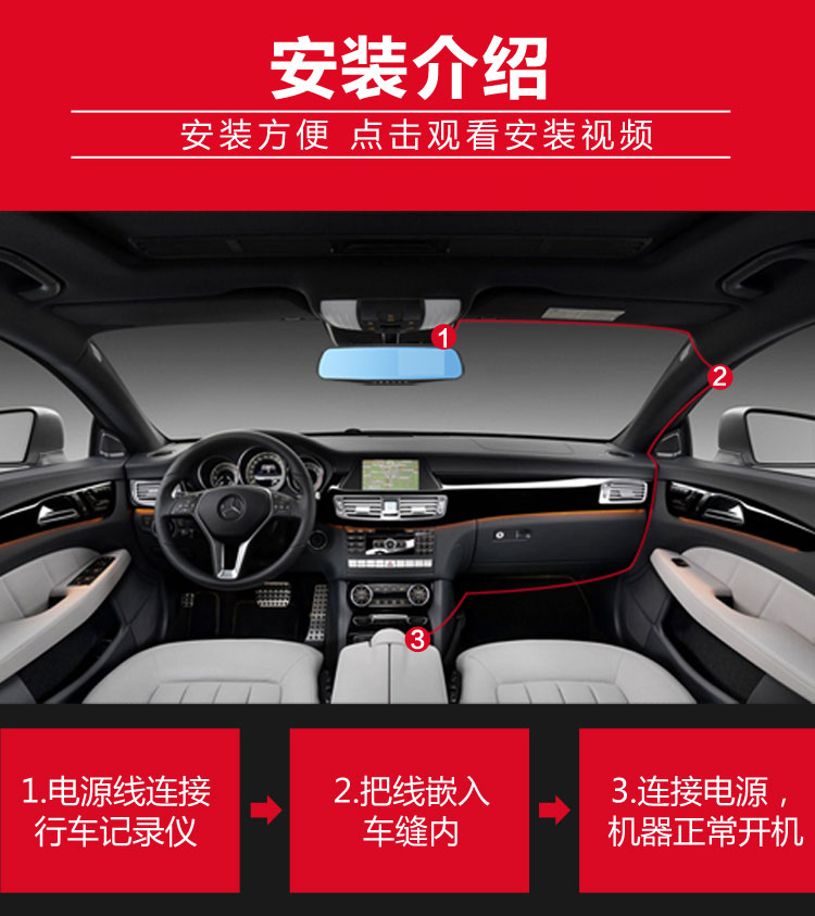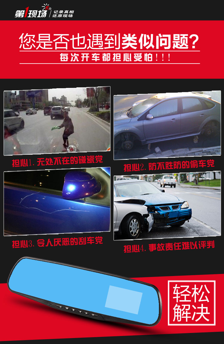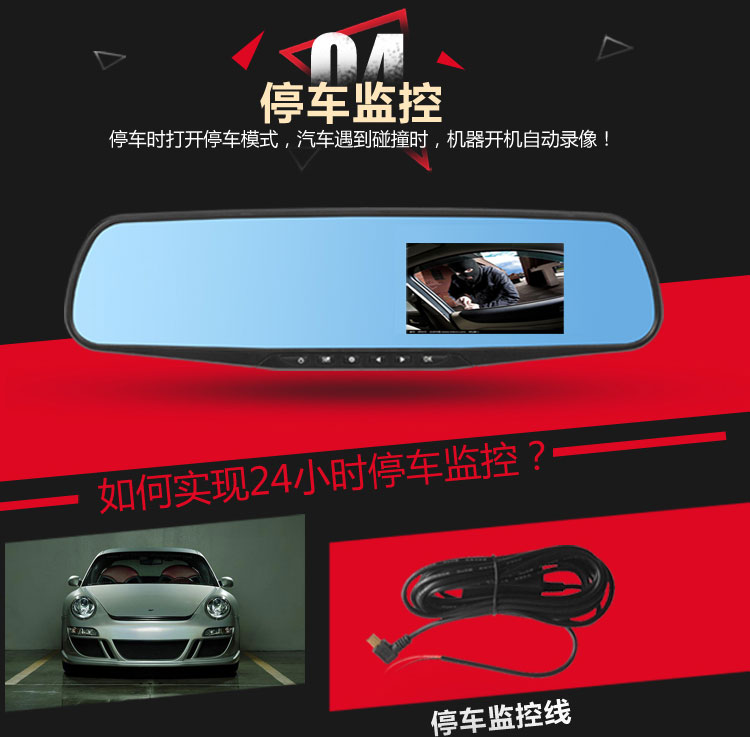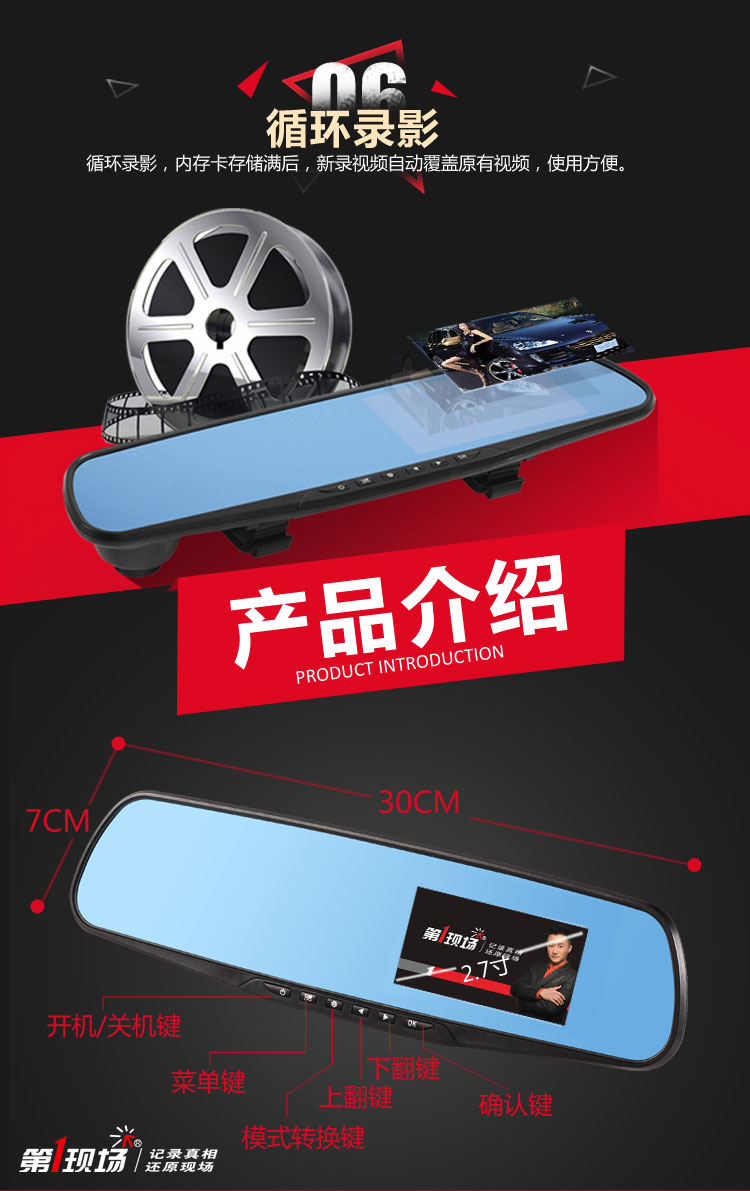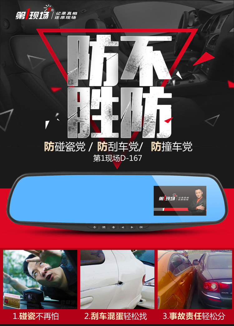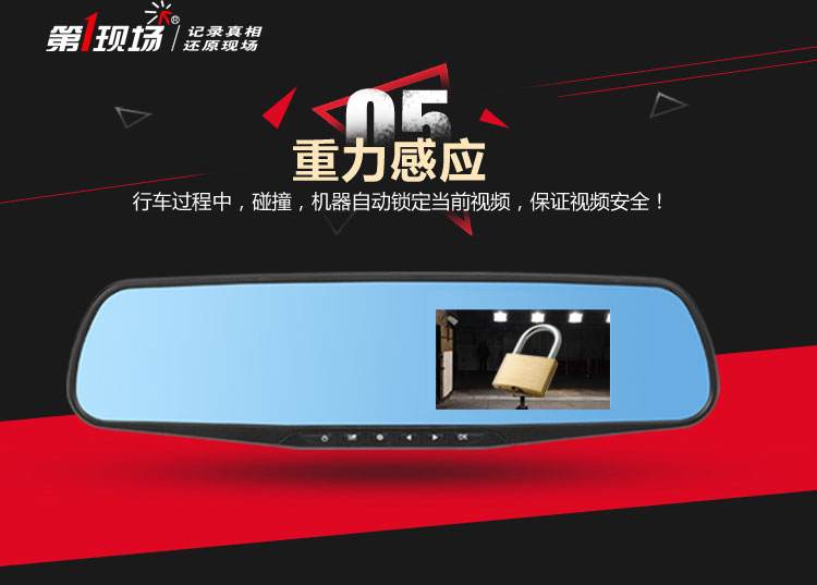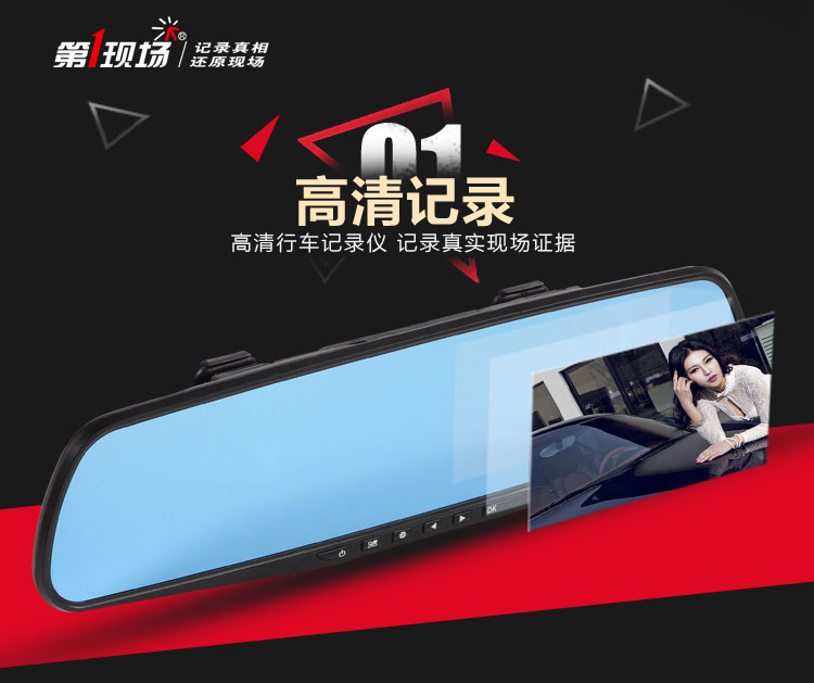概述:第1现场D167是第一现场品牌礼品渠道爆款热销机型,适合各行业促销馈赠!后视镜单镜头行车记录仪,蓝波镜面,2.4高清屏显,时尚机身设计,美观大方,功能实用,捆绑原车后视镜安装方便,超广角,500W像素。 (支持客户LOGO开机画面定制) 产品配置: 1、500万拍照像素,分辨率640*480P,录入速度30桢/秒 2、90度A+级广角高解析镜头,超强夜视功能 3、2.4寸TFT液晶显示屏;画面细腻高清.采用极致蓝光玻璃,无眩目,更安全。 4、全天侯停车监控模式;